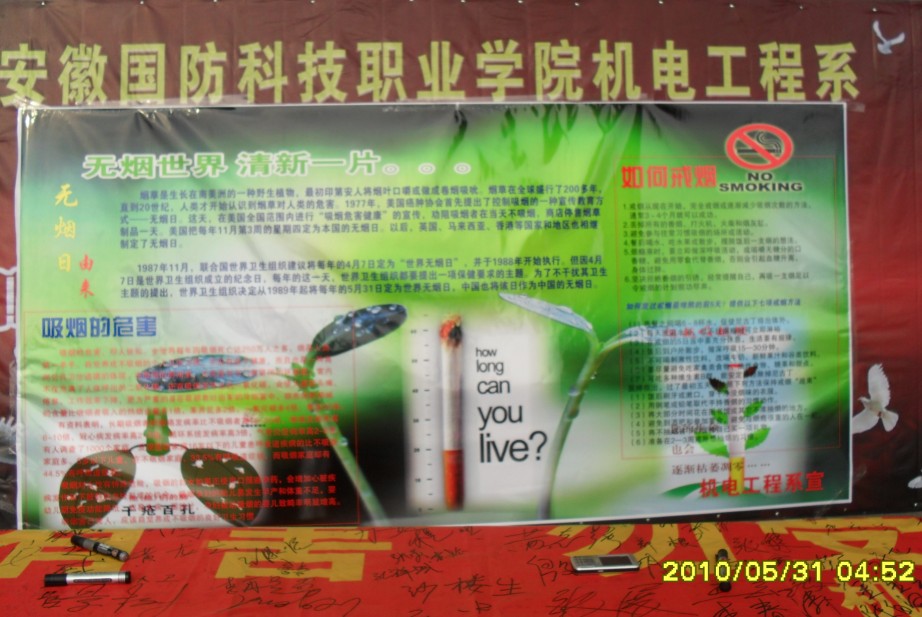 5月31日,在第23个“世界无烟日”,由机电工程系组织的“吸烟有害、勿受诱惑” 大型控烟系列活动之主题签名活动,于下午4:30在教2楼前顺利开展。