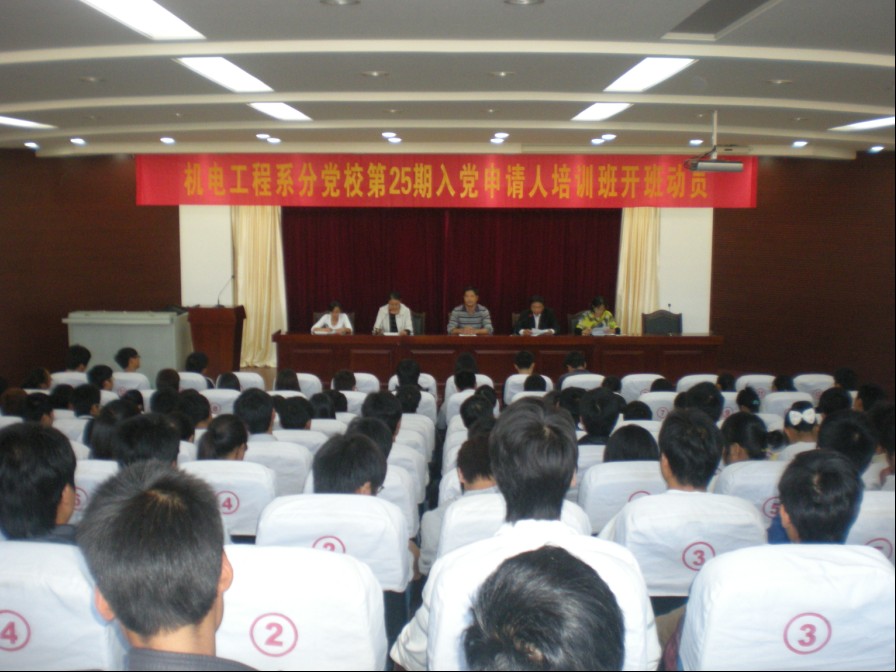 本期培训班学习活动历时一周,共计555人报名参加,于10月19日在图书馆报告厅举行动员大会,会议由学生党支部书记史媛芳主持,机电工程系党总支书记孙良平、副书记叶启衡、团总支书记刘严、辅导员戴柳及部分学员参加了动员大会。会上叶书记宣读了本期培训班相关通知并对学员提出了要求,孙书记为学员作培训班动员讲话,孙书记表示当代大学生要提高综合素质,尤其是积极提高政治思想素质,做政治上积极要求进步的大学生;其次,学员们必须学会思考,养成独立思考的习惯,树立独立的见解;同时,孙书记重点强调了党员干部的带头作用,在此次党校培训中必须严格遵守学习纪律,养成良好的学习习惯。