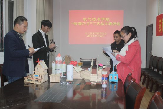 根据《关于在全院范围内开展第十二届寝室文化节的通知》文件精神,在前期广泛宣传和搜集作品的基础之上,11月27日晚上,电气技术学院“智慧巧手”工艺品大赛评选活动拉开帷幕。担任评委的老师和学生有电气技术学院团总支书记侯超众、辅导员汤晓莉、学生会副主席徐越翔、生活部部长董小雷、副部长方彪,共有17件手工品参与评选。