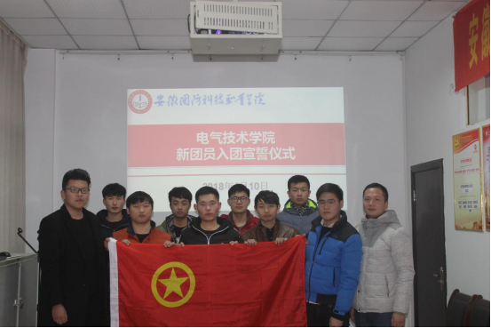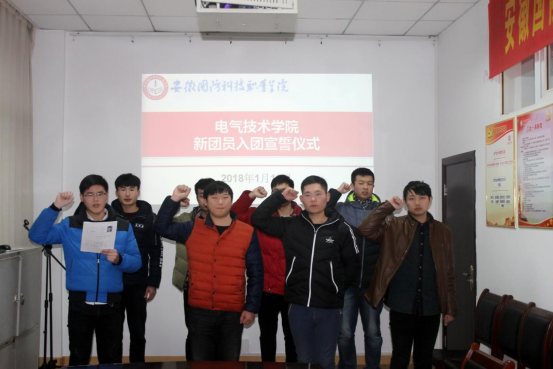 为进一步贯彻落实党的十九大精神和壮大中国共青团的队伍,向团组织输入新鲜血液,2018年1月10日晚上8:00,电气技术学院团总支在行政楼102会议室举行新团员入团宣誓仪式,仪式由电气技术学院团总支书记侯超众主持,团总支学生会主要干部及七名新团员参加了本次入团宣誓仪式。