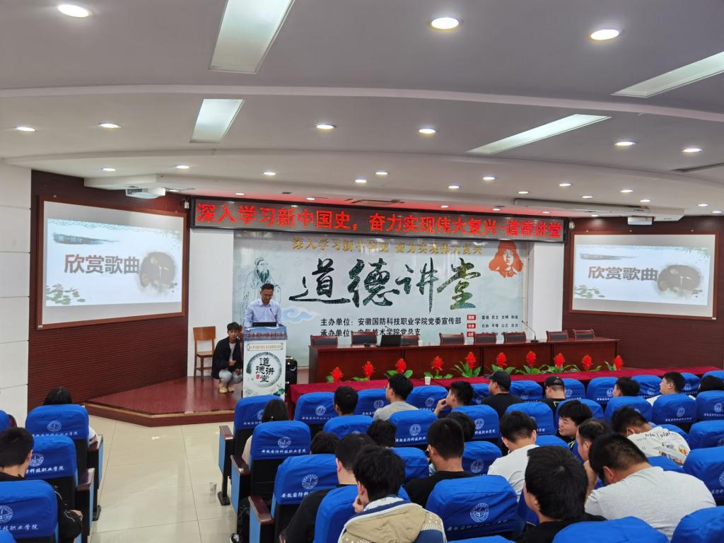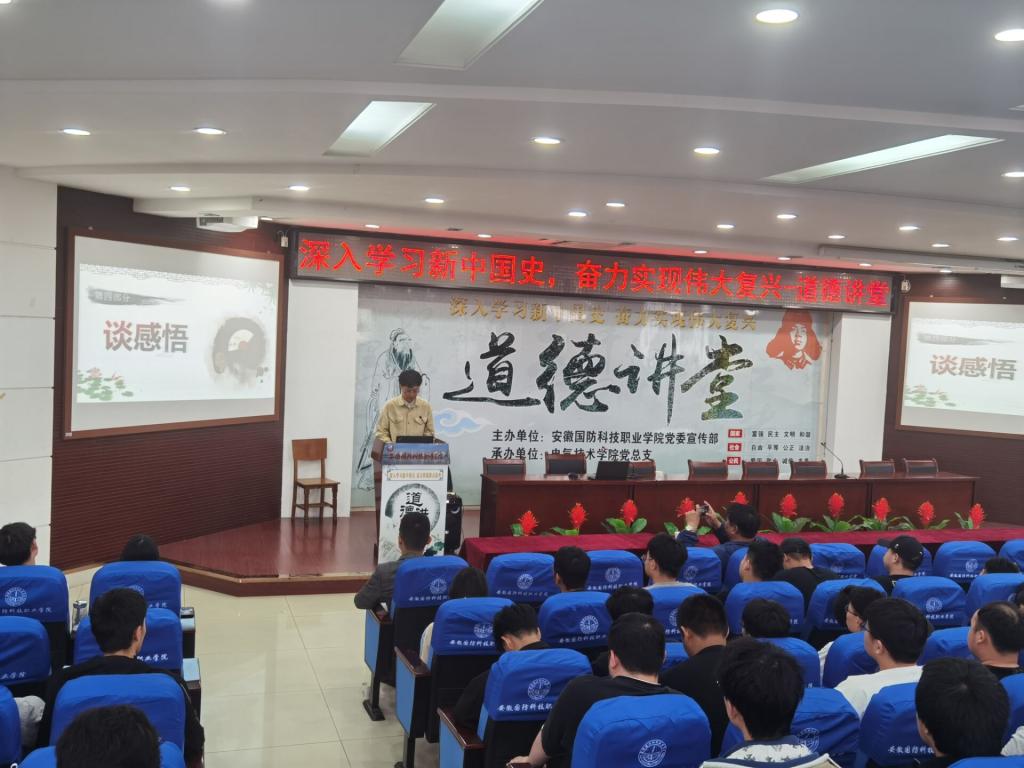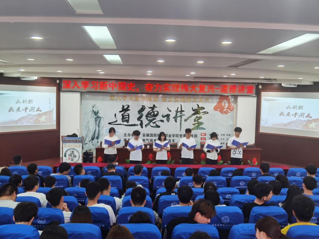 为弘扬中华民族传统文化,积极培育践行社会主义核心价值观,根据庆祝建党100周年有关文件精神和《关于开展2021年六安市“道德讲堂”活动的通知》(六文明办〔2021〕5 号)等精神,结合新冠疫情防控实际,和学校党政工作要点等工作安排,电气技术学院于2021年5月12日下午开展“深入学习新中国史,奋力实现伟大复兴”主题道德讲堂活动。