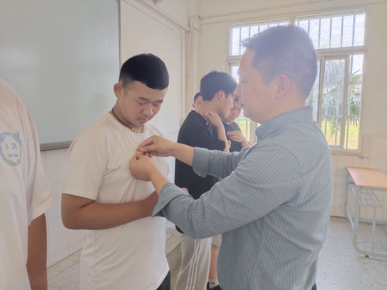 侯超众给新团员颁发、佩戴团徽,并接着带领8名新团员面对鲜艳的团旗,举起右手进行庄严宣誓。