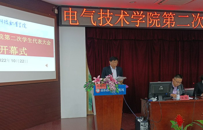 上午8点10分,大会在庄严的国歌中拉开序幕。开幕式上,电气技术学院党总支书记叶启衡致开幕词,他代表学院党总支对大会的成功召开表示祝贺,他希望学院各级学生会组织要主动顺应时代发展潮流和青年成长成才规律,积极应对新形势、新挑战、新使命,加强思想政治引领,建设学习型学生会;坚持从严治会,塑造清新组织形象;聚焦主责主业,全心全意服务同学。