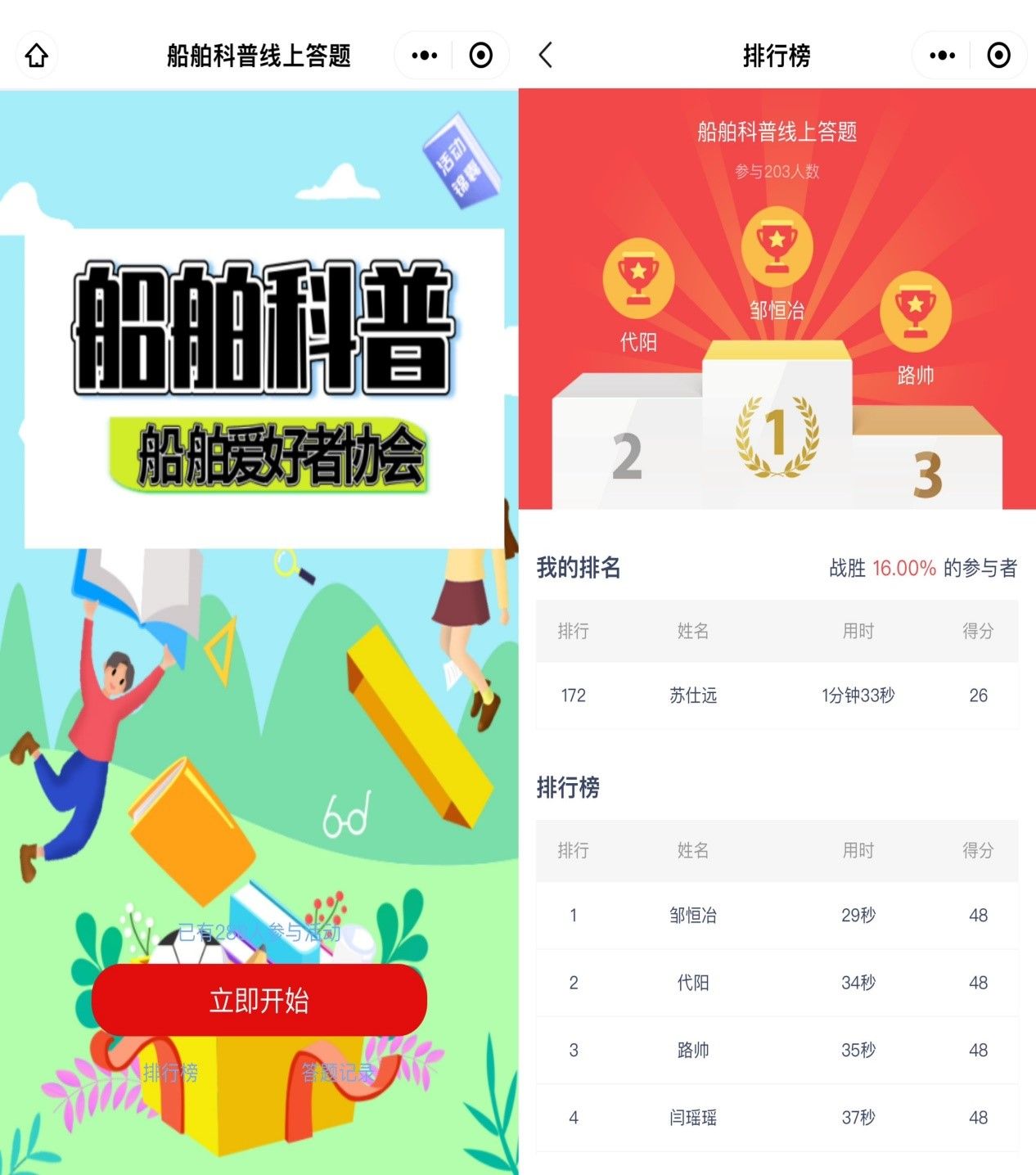 本次活动,通过随机形式发放船舶类科普题17道,要求参与线上作答的同学以最短的时间完成。比赛名次从全部答对的同学中,以用时长短排序。经过激烈角逐,共计有12位同学从198名参与答题的同学中脱颖而出,分别获得比赛一、二、三等奖。