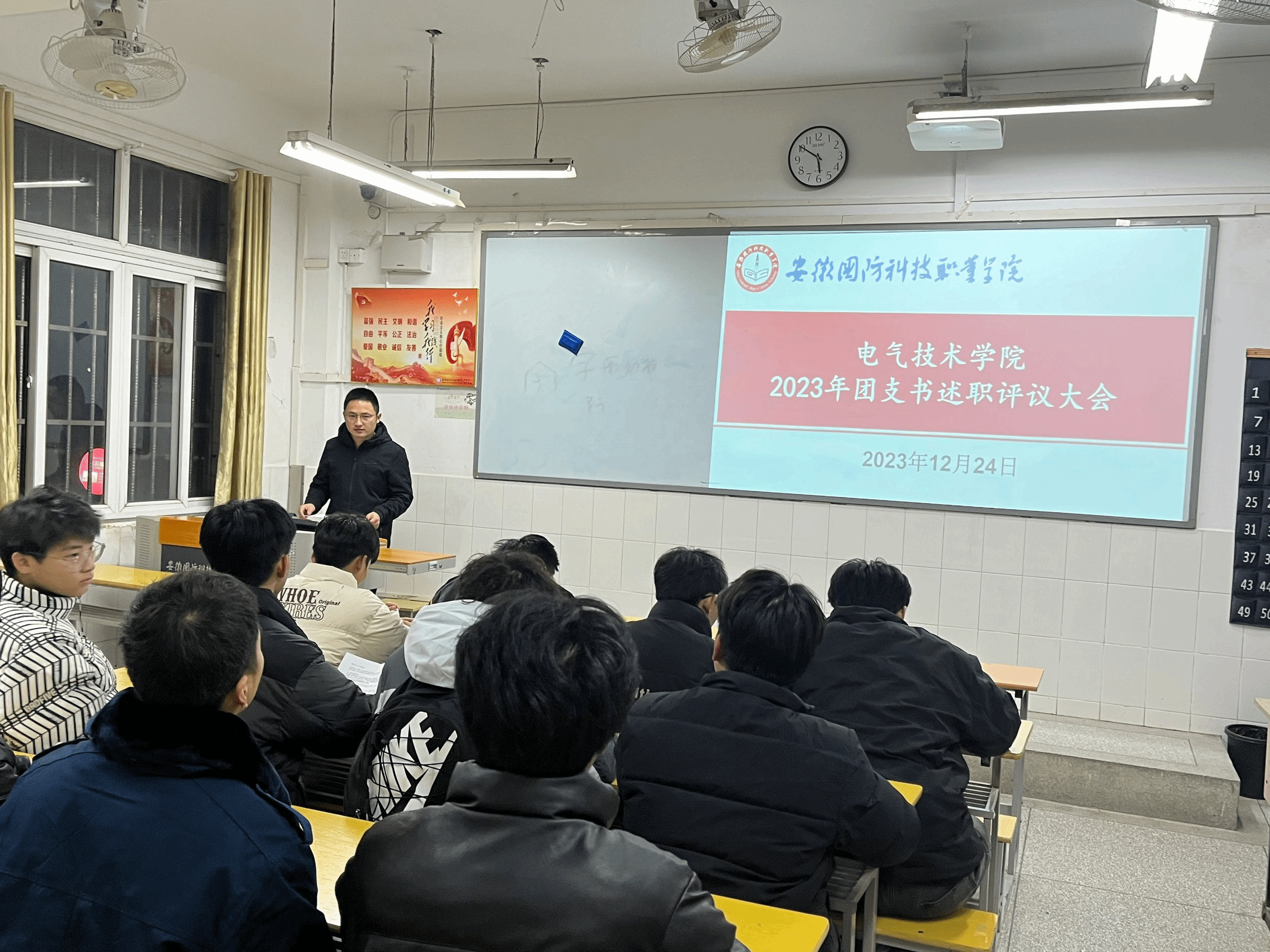 为深入学习宣传贯彻党的二十大精神,进一步深入贯彻习近平总书记关于青年工作的重要思想,持续全面深化共青团改革和全面从严治团,提高基层团组织的引领力、组织力、服务力和大局贡献度。12月24日晚,电气技术学院组织各班级团支书和团员代表在2教102教室召开2023年团支书述职评议会议。此次会议由学院团总支书记陈俊主持。