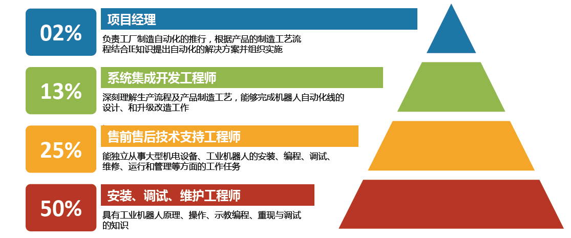面向工业机器人制造、系统集成企业,培养具备扎实的工程实践基础、良好的职业道德、较强的可持续发展能力的工业机器人电气设计助理工程师、电气制造助理工程师、系统集成助理工程师、工业机器人销售、服务助理工程师。