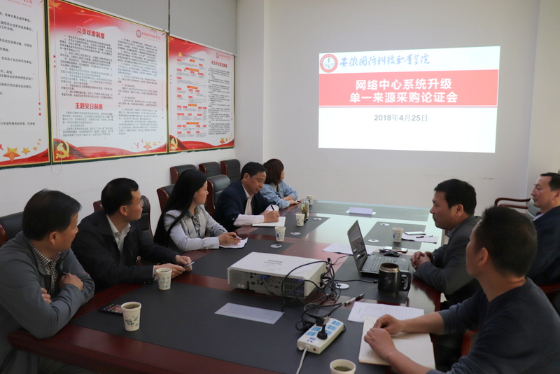 为了进一步促进应用系统建设,推动学院信息化发展,4月25日下午,在图书馆会议室召开了2018年应用系统升级单一来源采购论证会。网络信息中心邀请了皖西学院网络中心主任周先存、皖西卫生职业技术学院图文信息中心主任罗志东、六安职业技术学院网络中心主任陈功平作为校外专家,邀请了学校纪检书记陈兆同、财务处处长李大武,国资办干事董芳作为校内专家参加评审,参加会议的还有学校网络中心主任李中永、副主任范文广、信息系统管理员洪腾飞等。