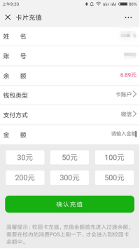 3、绑定账号后选择卡片充值进入充值界面,支付方式可以选择银行卡支付或微信支付。选择或输入充值金额确认充值后输入支付密码即可充值成功。说明:微信充值到账时间会有延时。
