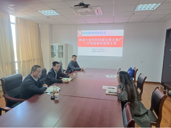 10月17日下午,六安市科协副主席汪圣广、金安区科协主席夏登峰、金安区科协科普部部长王永李一行到beat365开展科研交流工作,教务处副处长白斌丽及科研处工作人员参加交流活动。