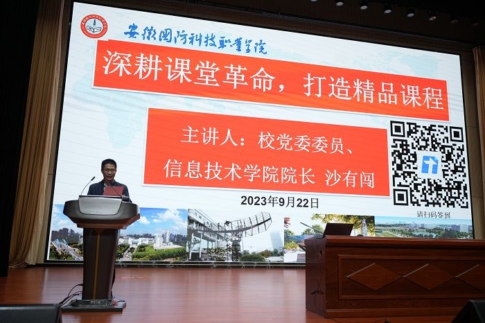 为进一步加强学校在线精品课程建设与申报工作,引领教学内容和教学方法改革,提高人才培养质量,9月22日下午3点,科研处邀请校党委委员、信息技术学院院长,安徽省模范教师、省级教学名师、安徽省教坛新秀,安徽省五一劳动奖章获得者,六安市拔尖人才,全国职业院校技能大赛优秀工作者,现主持职业教育国家级在线精品课程的沙有闯院长在产教融合中心A区一楼报告厅为全校教师开展“深耕课堂教学,培育精品课程”专题讲座。教务处(科研处)处长朱修传、副处长白斌丽、韩玉龙以及全体专任教师参加了本次讲座,讲座由朱修传处长主持。