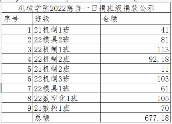 为进一步弘扬慈善文化,营造良好慈善环境,积极助力乡村振兴,根据《关于开展六安市直单位2022年“慈善一日捐”活动的通知》(六慈〔2022〕11号)(校办〔2022〕32号)文件精神,现就机械技术学院学生中开展“慈善一日捐”活动各班级捐款公示如下: