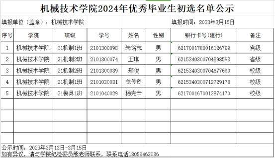 机械技术学院2024年优秀毕业生初选名单公示