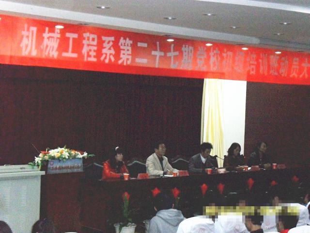 为了进一步提高入党申请人对党的认识,确保学生党员的发展质量,机械工程系于10月22日在报告厅召开了第27期党校初级班培训动员大会。系党总支书记束传俊,副书记孙武,学生党支部书记项华,辅导员老师张艳华、杨静出席并做报告指导,230余名学生参加大会。大会由学生党支部书记项华主持。
