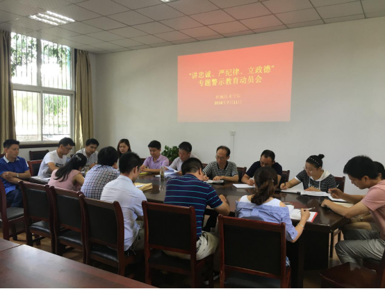 为认真贯彻落实校党委《》文件精神,7月11日下午,机械技术学院党总支召开了“讲忠诚、严纪律、立政德”专题警示教育动员会,会议由张宗江主持,全体党员参加了会议。