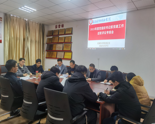 (机械技术学院 项华)3月27日,机械技术学院党总支在知行楼120召开2023年基层党组织书记抓党建工作述职评议会,党总支班子成员、各支部书记及部分党员和群众代表参加会议。