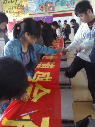 我系先后组织开展了“迎世博树新风”征文比赛、签名和礼仪讲座。其中,“迎世博树新风”大型签名活动还走到了六安滨河公园,吸引了众多市民参加。