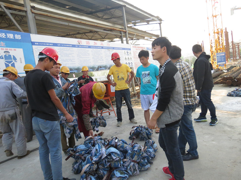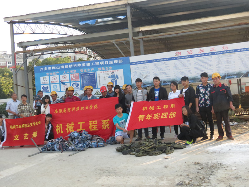 针对每年新生军训后军训服装大多无用乃至丢弃的现象,我系文艺部萌生了通过募捐方式将部分军训服收集起来赠送给在六安市务工的农民工的想法,同时也得到我系青年实践部的大力支持。通过前期的进班宣传,同学们捐赠军训服服的热情很高,分布在校园里的各个捐赠点前人头攒动,共募捐到军训服200余套,10月11日下午,文艺部协同青年实践部前往六安市梅山楠路大桥建筑工地举行了军训服装赠送仪式,向为城市建设而付出辛勤劳动的农民工送去了温暖与祝福。