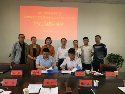 为深入贯彻落实党的十九大精神,创新党建工作方法,深化校企合作,全面推进创先争优活动深入开展,促进校企基层党组织开展结对共建活动,确保结对共建活动扎实有效地开展。5月23日下午,机械技术学院党总支与安徽博微长安电子有限公司大件加工党支部在机械技术学院会议室召开了党组织结对共建实施方案对接签订会。
