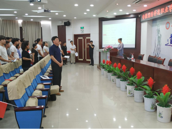 紧接着第二环节,全体师生起立,在机械技术学院党总支副书记陈思的带领下,昂首挺胸,饱含深情朗诵《三字经》。作为从古至今广为人知的经典之作,它所蕴含的亘古不变的深刻道理,值得每一个人去诵读去体会。