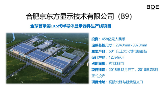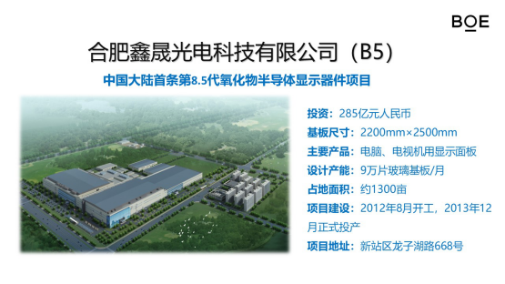 合肥目前拥有一条总投资175亿元第6代(B3)、一条总投资335亿元8.5代(B5)和一条总投资458亿元第10.5代TFT-LCD线(B9),产品覆盖全尺寸液晶产品,适用于电视机、桌面电脑、笔记本电脑、平板电脑、手机等产品的显示器件。