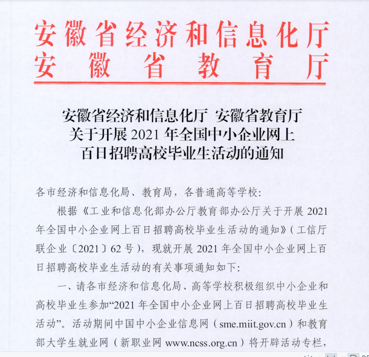 省经济和信息化厅+省教育厅关于开展2021年全国中小企业网上百日招聘高校毕业生活动的通知