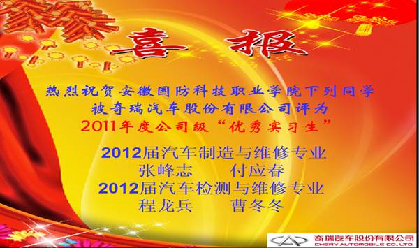 按照学院顶岗实习计划安排,我院2012届年毕业实习工作于去年底展开,有35名专业对口的同学到奇瑞汽车股份有限公司实习,他们工作态度认真、专业知识扎实,经过不断的努力,都取得了较好的成绩。其中2012届汽车制造与维修专业专业张峰志、付应春,汽车检测与维修专业程龙兵、曹冬冬等4位同学凭借扎实的专业基础,努力提高自己的业务水平,在较短时间内适应了企业环境和工作要求并取得了突出的工作业绩,得到公司的充分肯定,被该公司评为“2011年度优秀实习生”,公司给予了一定的奖励,并将在其实习期结束后优先录用。