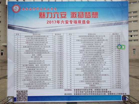 “偕行魅力六安,成就精彩未来。”作为2017年秋季学生顶岗实习双选会的第一场,其成功举办也为紧接而来的主题专场双选会打好头阵,做好铺垫。