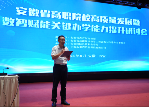 任雯君主任阐述了大会推进安徽教育数字化战略行动的目的,强调了数智赋能职业院校关键办学能力提升的重要性,提出了高职院校要坚定不移地强化内涵建设,以高质量发展为总揽,积极构建新时代质量提升体系的要求,并正确认识和处理好改革发展过程中的服务高质量发展、关键办学能力、“双高”建设与数字化转型的关系,持续提升学校治理体系和治理能力现代化水平,培养更多高素质技术技能人才、能工巧匠、大国工匠,更好地服务支撑现代化美好安徽建设,为加快建设人民满意的教育强省贡献高职力量。另外,就2023-2024 学年高等职业学校人才培养工作状态数据采集工作,提出三点要求:一是提高认识,二是强化统筹,三是提升质量,要求各高职院校切实做好数据采集管理工作。