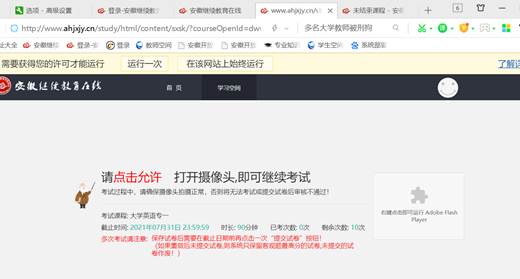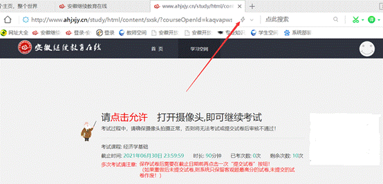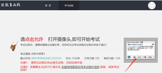 4. 上述步骤已完成(已使用360安全浏览器并安装好flash),重新进入考试页面,请点击“允许”按钮进入考试。如下: