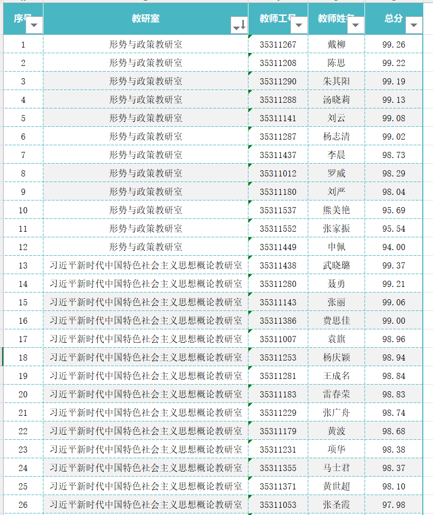 根据学校关于印发《beat365在线唯一官网教师教学质量考核评价办法(修订)》的通知(校教[2022]9号)文件精神,马克思主义学院汇总学生评价、同行评价、教师履行教学工作规范考评、教学单位评价分数,通过加权求和计算出教学评价成绩(见附表1),现在本单位内部公示3个工作日(2024年1月30日-2月1日),如有异议,请在公示期内书面向马克思主义学院反映,邮箱:ahgfmy@163.com。逾期不予受理。