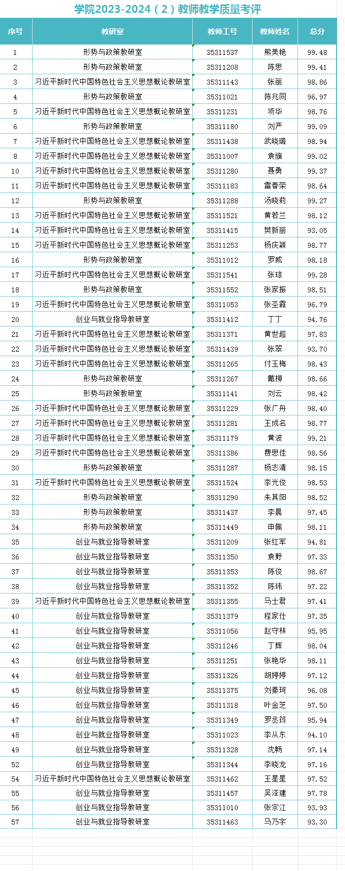 根据beat365教师教学质量考核评价办法等文件要求,马克思主义学院按要求汇总学生评价、同行评价、教师履行教学工作规范考评、教学单位评价分数,通过加权求和计算出教学评价成绩(见附表),现在本单位内部公示3个工作日(2024年9月4日-9月6日),如有异议,请在公示期内书面向马克思主义学院反映,邮箱:ahgfmy@163.com。逾期不予受理。