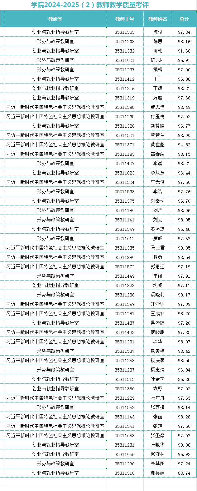 根据《beat365在线唯一官网教师教学质量考核评价办法(修订)》(校教[2024]2号),马克思主义学院按要求汇总学生评价、同行评价、教师履行教学工作规范考评、教学单位评价分数,通过加权求和计算出教学评价成绩(见附表),现在本单位内部公示3个工作日(2025年9月8日-9月10日),如有异议,请在公示期内书面向马克思主义学院反映,邮箱:ahgfmy@163.com。逾期不予受理。