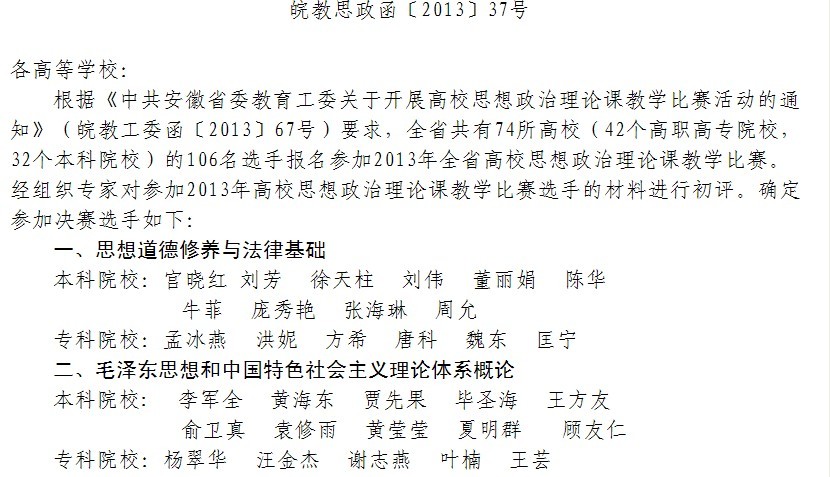从安徽省思政与安全教育网获悉,思政部匡宁老师经过赛事组委会的初评,成功晋级安徽省高校思想政治理论课教学比赛决赛环节。这得益于学院和思政部对思想政治理论课建设的重视和对思政教师的培养。希望匡宁老师能够在决赛中获得好的成绩。