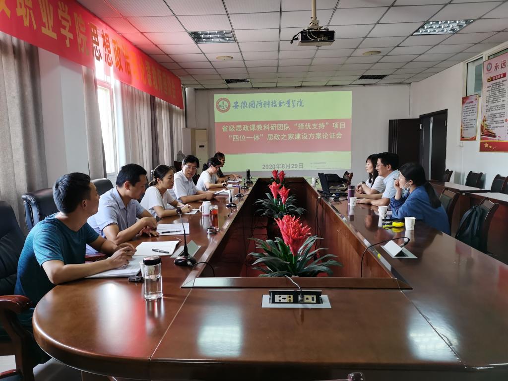 为持续深入学习贯彻落实全国全省教育大会和学校思想政治理论课教师座谈会精神,进一步提升思想政治工作能力,完成好安徽省高校思想政治理论课教学科研团队“择优支持”项目预期目标。思政部省级思政课教科研团队“择优支持”项目组于8月29日下午在思政部会议室召开“四位一体”思政之家建设方案论证会。会议由校党委委员、宣传部长、思政部主任、项目负责人袁旗主持,项目组成员、教师代表以及校外设计团队等人员参加会议。