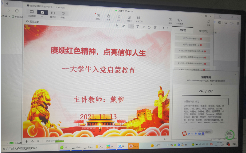 为了激发同学们的入党热情,增强对中国共产党的了解和认识,端正入党动机,把握入党程序和要求,2021年11月13日晚上6点,马克思主义学会在线上召开大学生入党启蒙教育大会。此次大会由社团指导老师戴柳主讲,全校近300名学生参加。