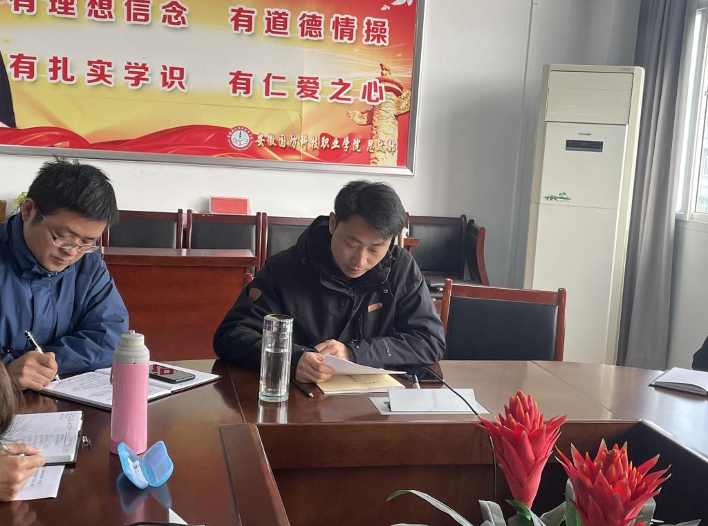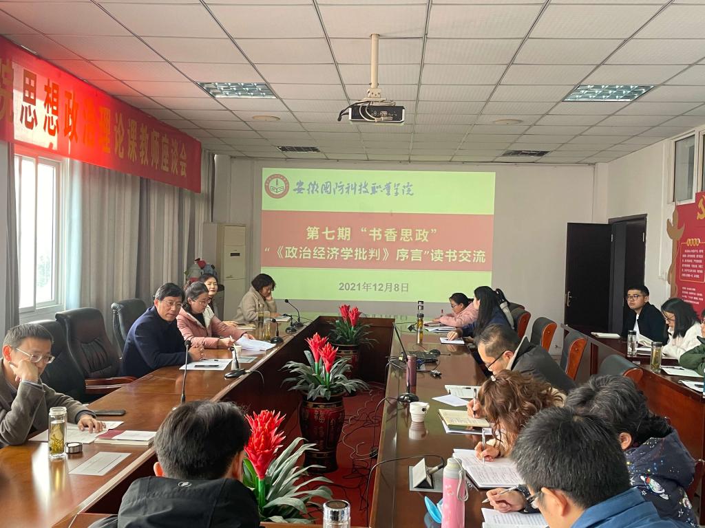 本网讯(思政部 费思佳)为进一步学习贯彻习近平新时代中国特色社会主义思想,持续深入打造“质量思政、书香思政、温馨思政”,提高思政课教师理论水平,提升思政课的思想性和理论性,12月8日下午,思政教学部在知行楼403会议室,举办了第七期“书香思政”读书活动,即“《经济政治学批判》序言”读书交流会。会议由校党委委员、思政部副主任陈思主持,校党委委员、副校长袁旗出席,思政教学部全体专兼职教师参加了本次会议。