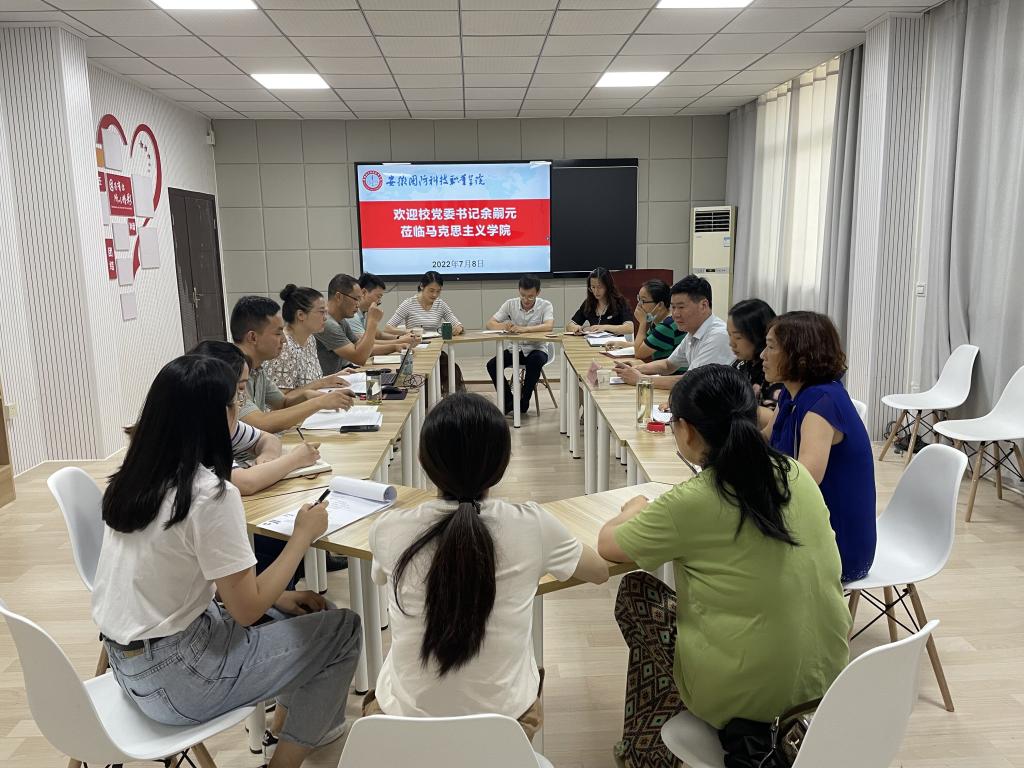 7月8日下午,校党委书记余嗣元到马克思主义学院调研指导工作,调研会议在马克思主义学院智慧教室召开。校党委委员、宣传部部长、马克思主义学院院长陈思主持了本次调研会议,马院各教研室主任、思政课教师参加了此次调研会议。