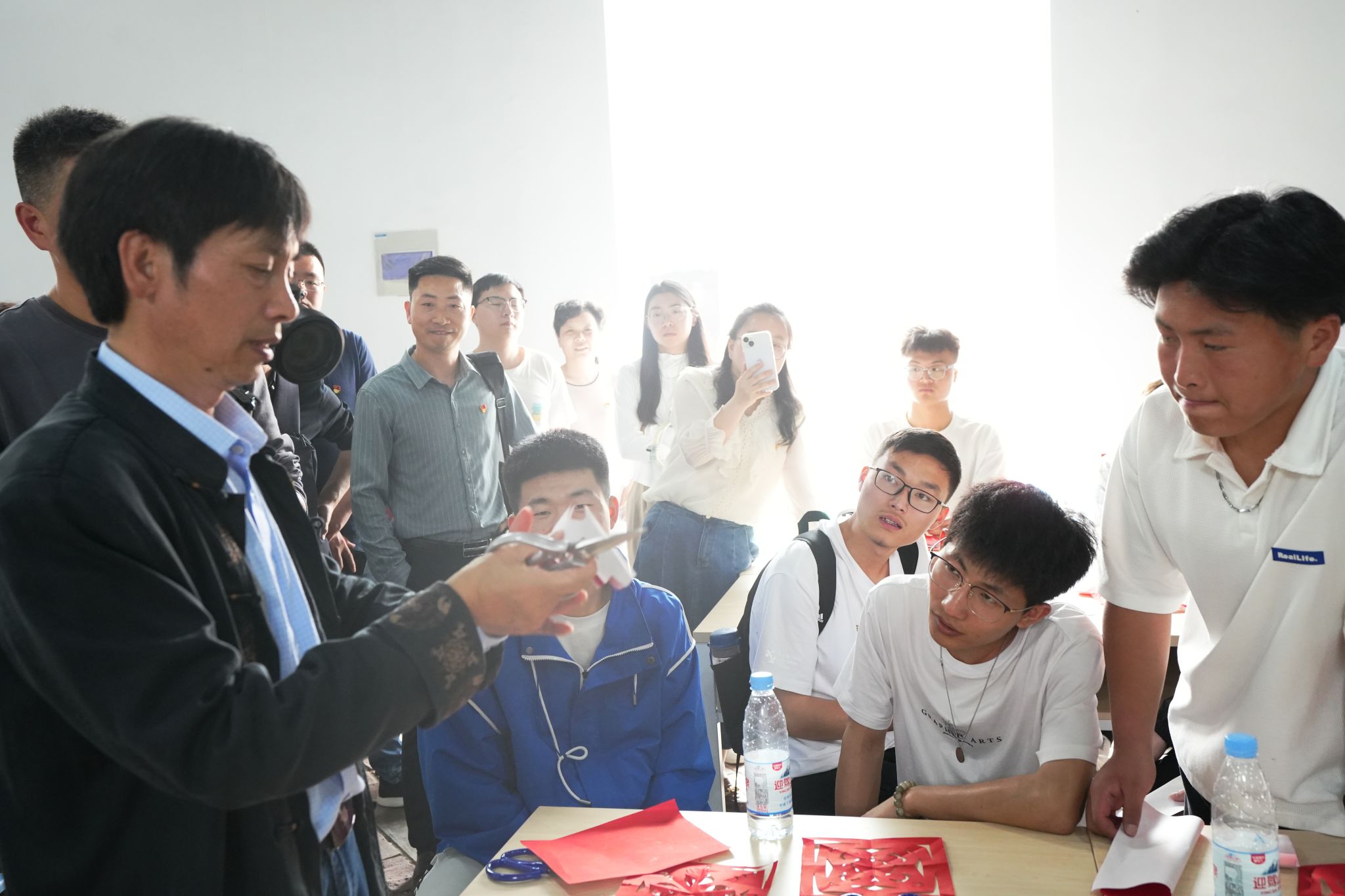 在校外课堂上,安徽省非物质文化遗产(翁墩剪纸)传承人、中国民间文艺家协会会员、安徽省工艺美术学会会员徐圣年老师为同学们介绍了翁墩剪纸的历史文化内涵与德育价值,并向同学们展示了部分作品。随后,徐老师耐心讲解剪纸技法并现场展示剪纸过程,对同学们的剪纸实践进行一对一的指导。