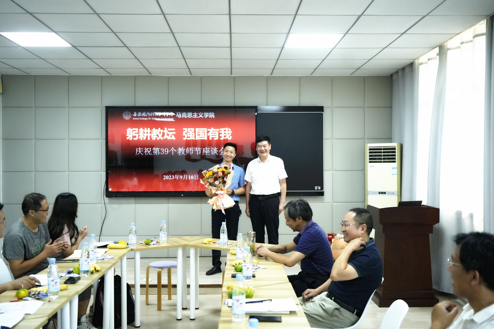 接着,马克思主义学院新进青年教师依次分享了入职感受和对教师职业的认知,并带来了《永远的追梦人》诗歌朗诵节目,一起共勉,共同为教育事业做永远的追梦人。为表达敬意,青年教师代表向光荣从教30年教师们献上了鲜花和祝福。为激励青年教师努力奋斗,发扬老教师“传、帮、带”的引领作用,光荣从教30年的教师为青年教师赠送了书籍,勉励青年教师继续传承、发扬好国防学院人的精神品质,继续开创美好的未来。