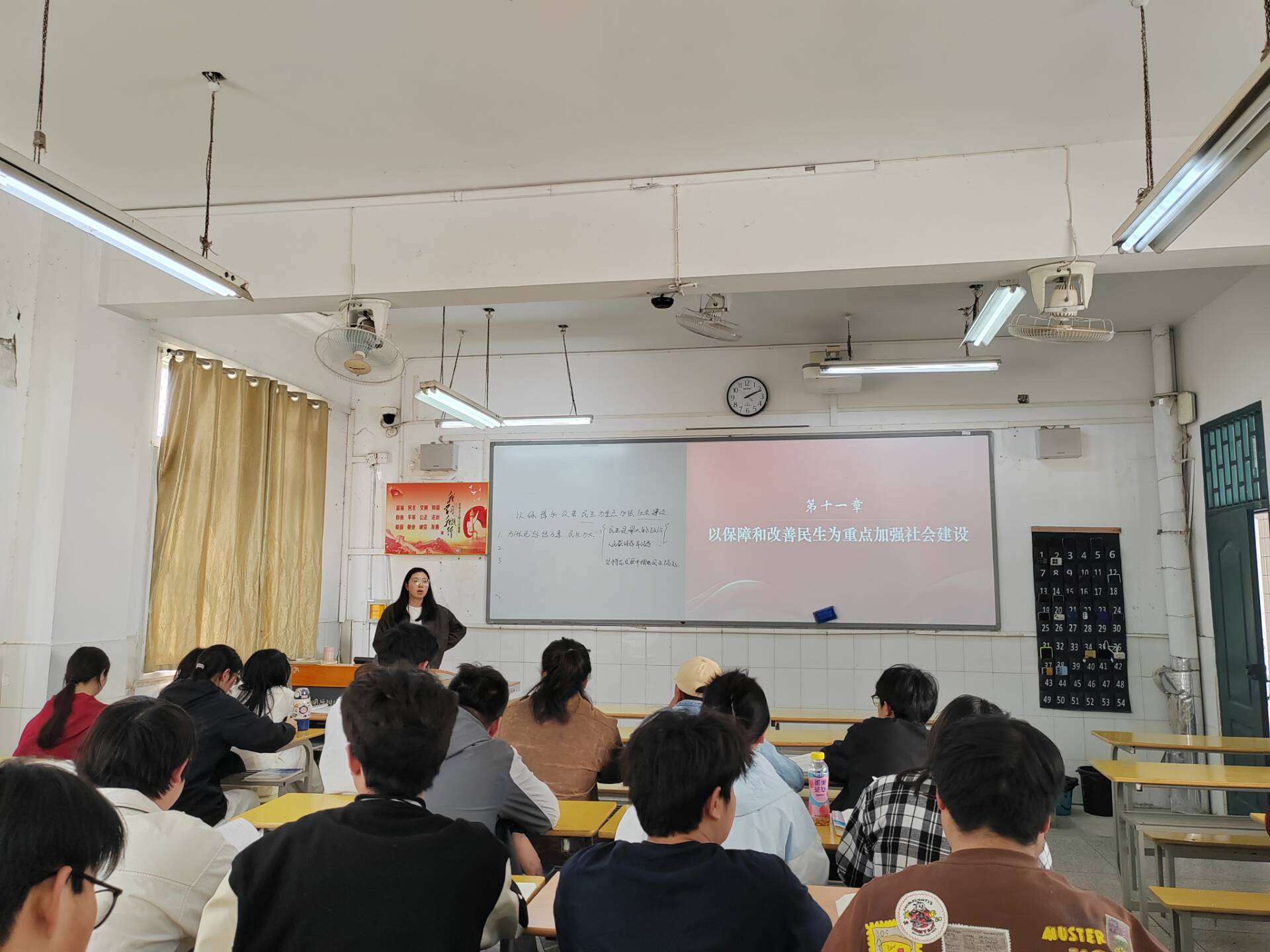 武晓璐老师于4月8日5-6节课在2教103教室为24工程造价1班主讲“以保障和改善民生为重点加强社会建设”