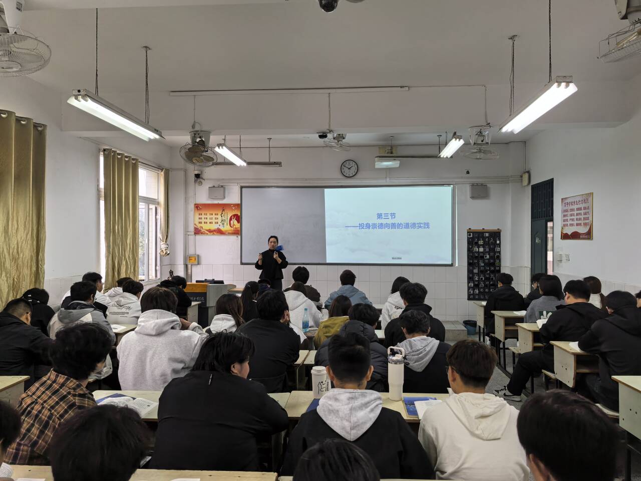 (刘严老师于11月17日5-6节在2教101为25新能源汽车2班学生讲授《投身崇德向善的道德实践》)
