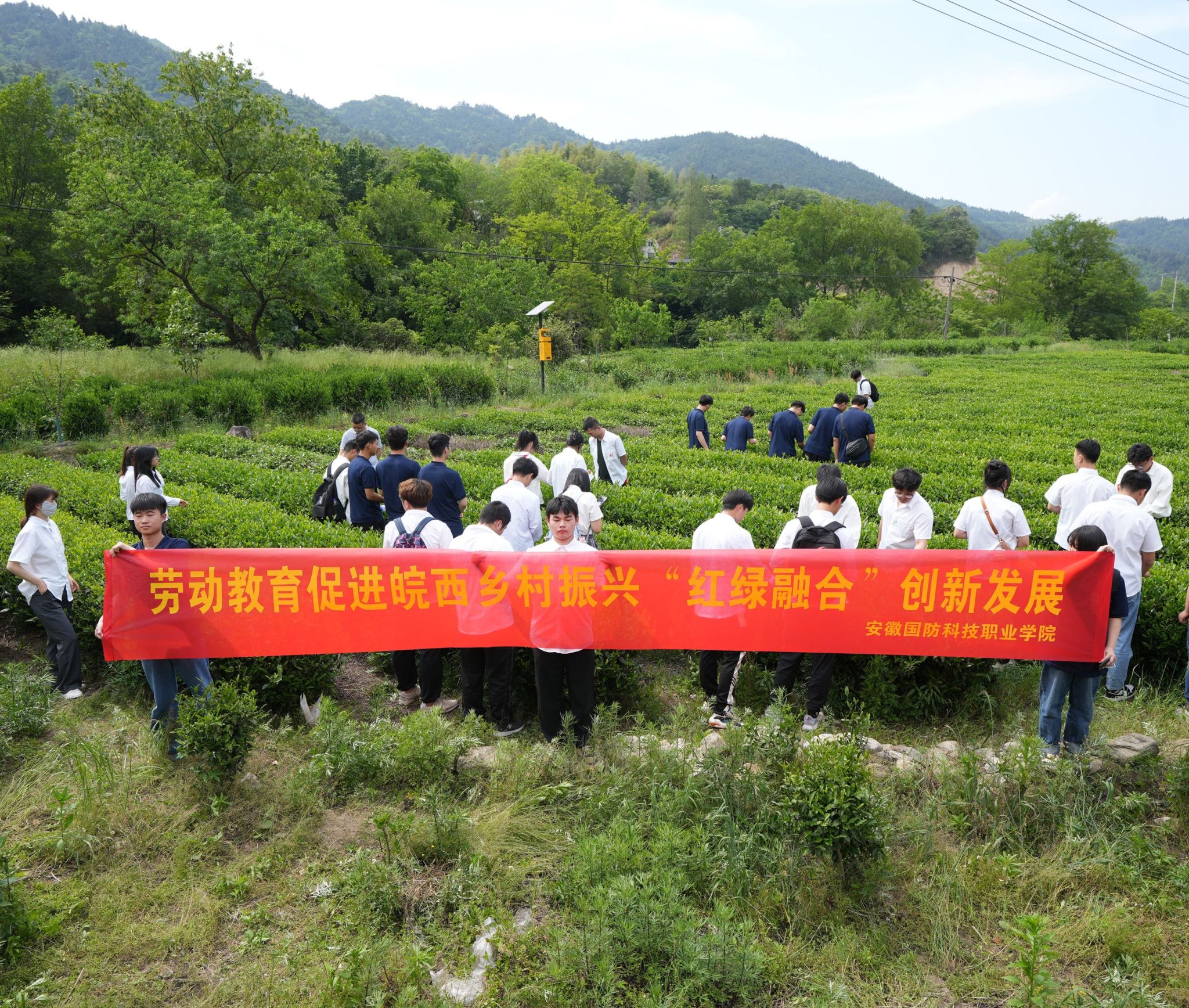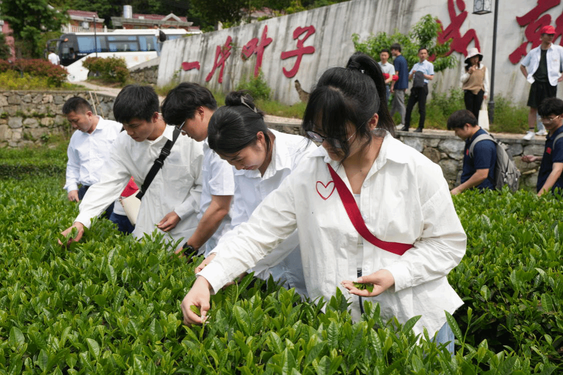 最后,同学们来到了茶园,听茶园负责人为大家讲述大湾村依托茶产业助力乡村振兴的经历。“一片叶子,成就了一个产业,富裕了一方百姓”,印刻在石墙上的这一行字,正是茶产业带动大湾村民众脱贫致富的生动写照。现场还为同学们详细讲解茶叶的品种、采摘时间和方式方法等知识,大家根据学到的采摘技巧,在茶园里采摘茶叶,在劳动中感受到茶农的艰辛,也体验到了幸福生活的来之不易。这一具体实践旨在让乡村振兴与劳动实践教育同频共振,促使同学们在劳动教育中淬炼品格,体悟乡村振兴使命在肩,深刻领会做任何事都要落实到具体行动当中来。