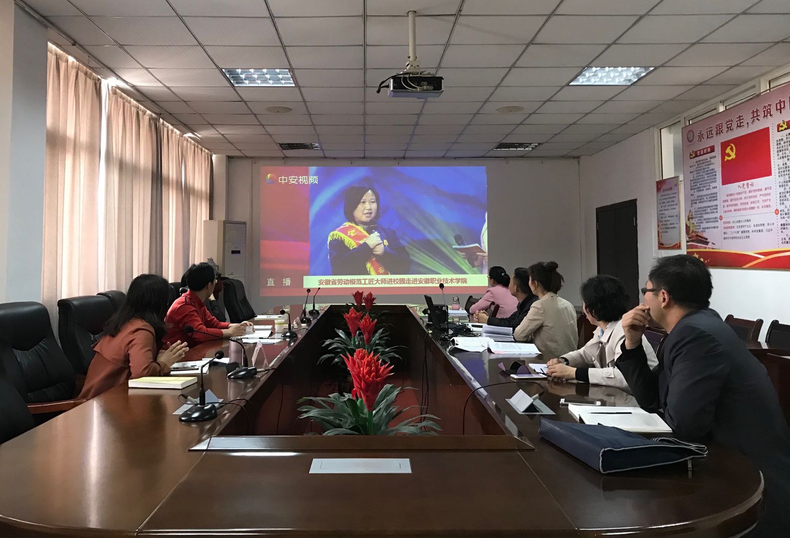 本网讯 为深入学习贯彻习近平新时代中国特色社会主义思想和党的十九大精神,贯彻落实习近平总书记在全国宣传思想工作会议、全国教育大会和学校思政课教师座谈会上重要讲话精神,创新思政教育方式,学习劳模工匠精神,根据《中共安徽省委教育工委关于组织收看安徽省劳动模范工匠大师进校园活动网络直播的通知》要求,4月3日下午,直属第二党支部在党员活动室组织观看了“安徽省劳动模范工匠大师进校园”活动网络直播,近距离感受劳模工匠风采。