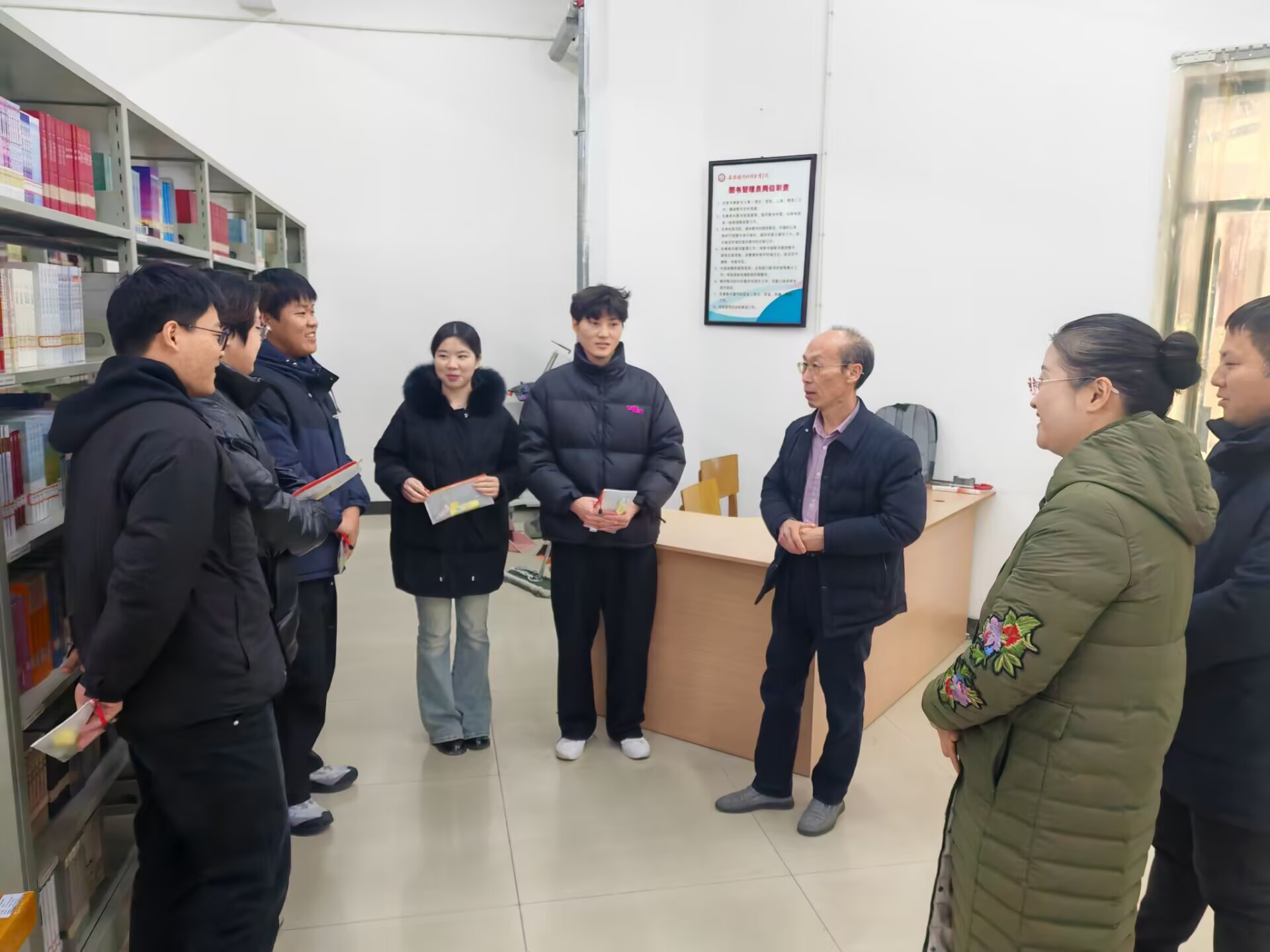 走访过程中,老师们首先来到了学校图书馆,黄祥书记与同学们亲切交谈,详细询问了大家的备考情况。看到同学们身后堆积如山的考研书籍和资料,黄书记对大家勤奋刻苦的学习态度表示赞赏。黄书记在慰问中说道,“无论结果如何,这段经历都将是你们人生中的宝贵财富。请相信,只要你们坚持到底,就一定能够收获属于自己的成功。”还为每一位考研学子送上了学习用品和真挚的关怀与鼓励。