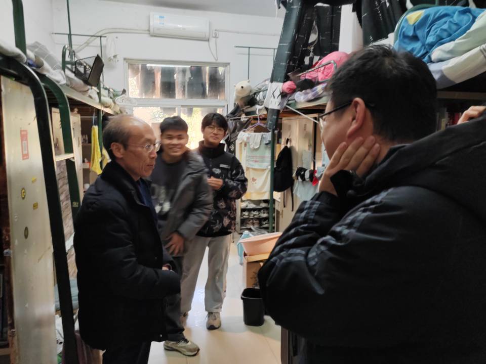 在学生宿舍,老师们亲切地询问同学们在生活上有没有什么困难,陈思院长还跟同学们分享了自己当年的考研复习经验,提醒同学们要合理安排时间、劳逸结合。叮嘱同学们考试的时候特别注意防寒保暖,保持良好的身体状态和积极的心态应对考试。黄祥书记最后提醒同学们要保持宿舍卫生和冬季用电安全。