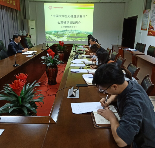 为了做好2019级大学生心理健康测评工作,10月21日下午五点半,beat365在思政部会议室召开大学生心理健康测评工作专题会暨“大学生心理健康测评系统”心理辅导员培训会,会议由校党委委员、宣传部部长兼思政部主任袁旗主持,心理健康教育中心工作人员和各二级学院心理辅导员参加了会议。