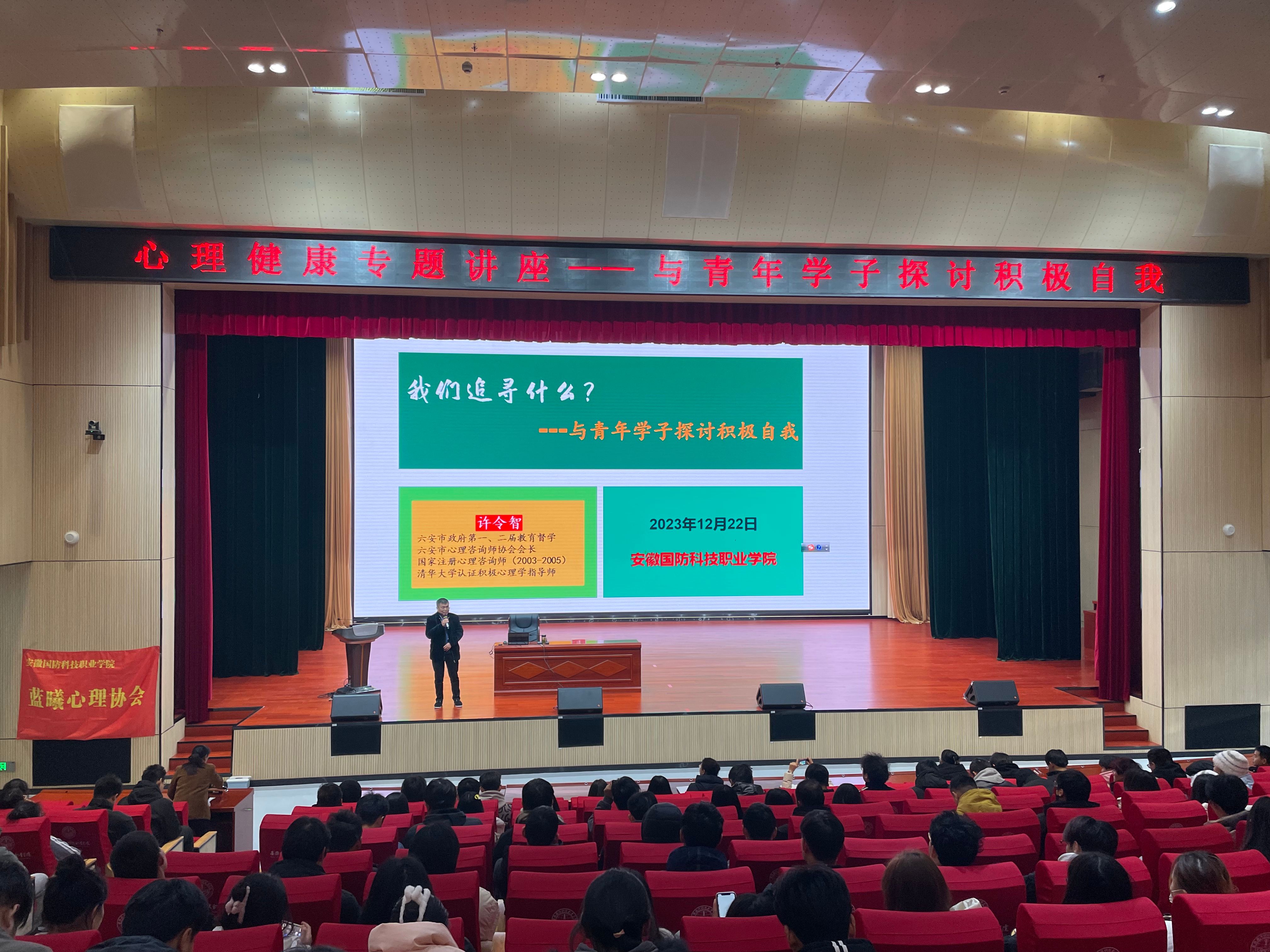 本网讯(马克思主义学院 戴柳)为了向大学生传播心理健康知识和理念,帮助同学们客观全面认识自我,提高学生的心理健康素养,12月22日下午,beat365在产教融合中心多功能报告厅举办心理健康知识讲座。本次讲座主题:我们追寻什么?--与青年学子探讨积极自我。此次讲座由心理健康中心主任戴柳主持,校党委委员、宣传部部长、马克思主义学院院长陈思、全体心理健康课教师、500余名学生代表参加,蓝曦心理协会做好了会务服务工作。