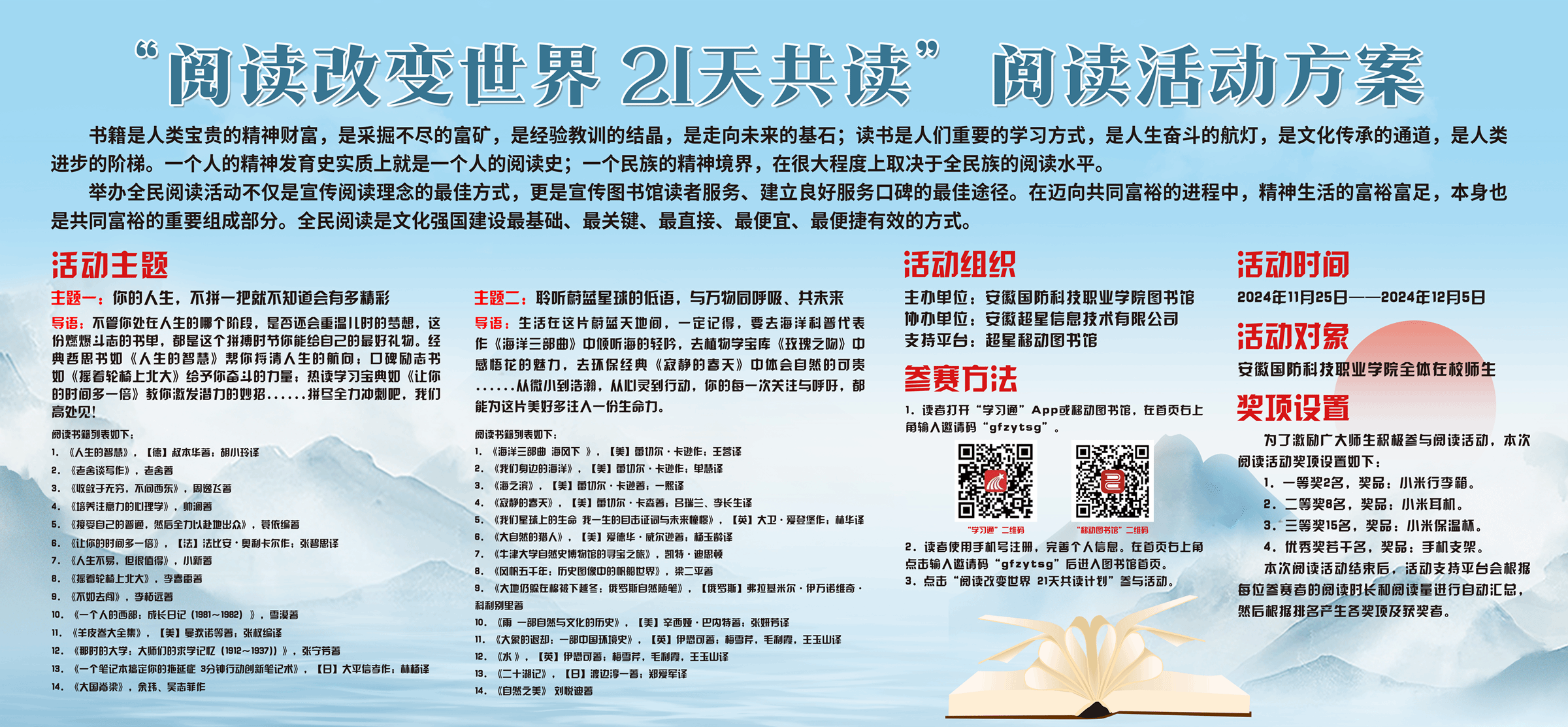 11/14142024-11置顶 关于组织开展“阅读改变世界21天共读”阅读活动的通知各单位(部门)、各班级:习近平总书记在致首届全民阅读大会的贺信中指出,阅读是人类获取知识、启智增慧、培养道德的重要途径,可以让人得到思想启发,树立崇高理想,涵养浩然之气。中华民族自古提倡阅读,讲究格物致知、诚意正心,传承中华民族生生不息的精神,塑造中国人民自信自强的品格。习近平总书记希望广大党员、干部带头读书学习,修身养志,增长才干;希望孩子们养成阅读习惯,快乐阅读,健康成长;希望全社会都参与到阅读中来,...