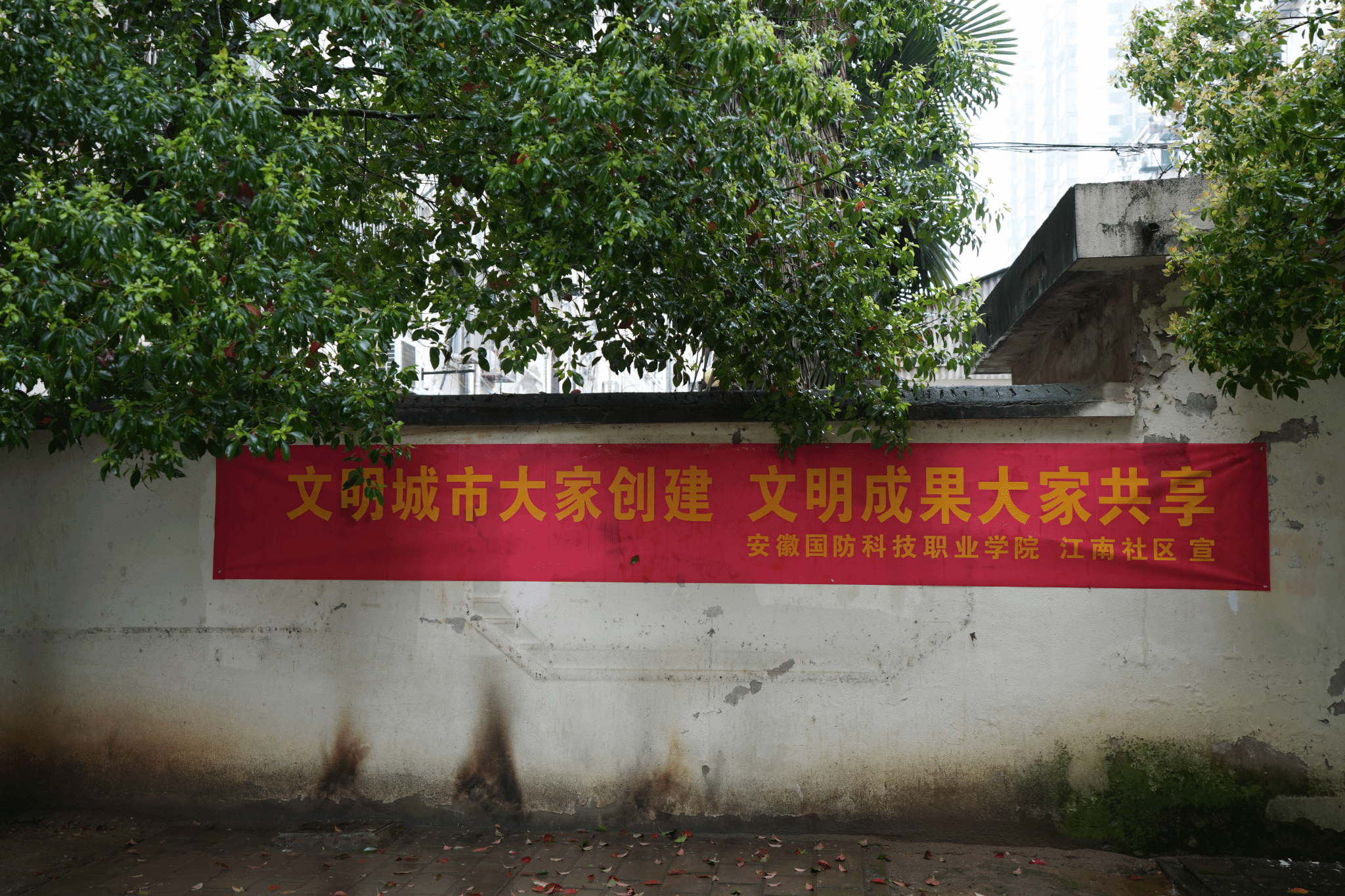 随后,全体成员携带夹烟钳、垃圾袋等卫生清理工具来到江南社区大别山新村志愿活动现场。虽然冒着蒙蒙细雨,但师生们丝毫不减热情,分组迅速投入到对该小区的环境卫生清理工作中。在社区干部的指引下,大家分别前往小区楼道等公共区域清扫垃圾杂物、清除小广告等,协助改善小区环境卫生,并在小区拉设文明城市宣传横幅,宣传引导小区居民自觉主动维护环境文明卫生,得到社区干部和小区居民的一致认可与好评。