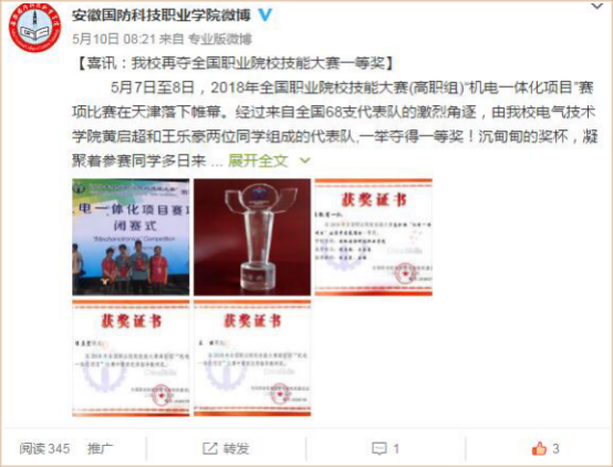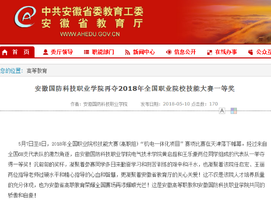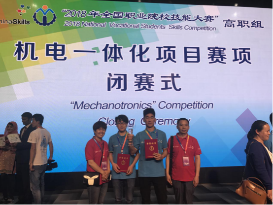 职教周活动开展期间,2018年全国职业院校技能大赛赛场再传捷报,由beat365师生组成的安徽代表队在“机电一体化”赛项中荣获团体一等奖。